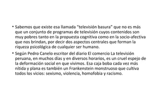 Este documento discute el impacto de la "televisión basura" en la mente y conducta de niños y adolescentes. Señala que muchos programas de televisión tienen contenidos pobres que no enriquecen el desarrollo psicológico. La televisión peruana a menudo muestra una deformación social y cultiva vicios como sexismo, violencia, homofobia y racismo. La "televisión basura" se refiere a programas degradantes que abusan del sexismo, atentan contra la dignidad humana o despiertan prejuic