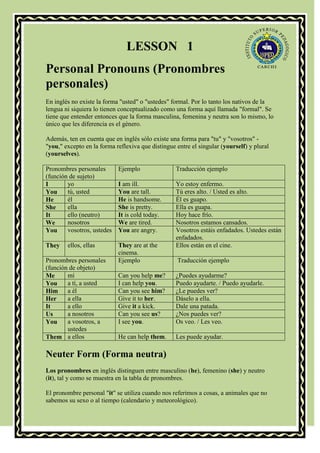 Este documento presenta una lección sobre pronombres personales, posesivos y demostrativos en inglés. Explica que no existe la forma "usted" en inglés y que sólo hay una forma para "tú" y "vosotros", "you". Proporciona tablas con los pronombres en función de sujeto y objeto, y ejemplos. También cubre los pronombres posesivos como determinantes y pronombres, la diferencia entre posesivos y el genitivo, y los pronombres demostrativos singular y plural para indicar distancia.