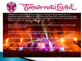 El festival de música electrónica Tomorrowland se celebra anualmente en Bélgica desde 2005. A lo largo de los años, el festival ha ido creciendo en tamaño, pasando de 9 escenarios en 2006 a más de 100 DJs y 50.000 asistentes en 2008. En 2009, la asistencia superó los 80.000, y en 2010 y 2011 se establecieron nuevos récords con 120.000 y 180.000 asistentes respectivamente. En 2013, los organizadores anunciaron un nuevo festival llamado TomorrowWorld que tendría lugar por primera vez en septiembre de ese