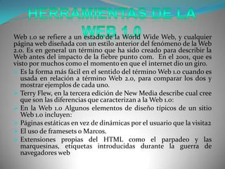 Web 1.0 se refiere al estado inicial de la World Wide Web caracterizado por páginas estáticas. La Web 2.0 introdujo sitios web dinámicos y colaborativos donde los usuarios pueden crear y modificar contenido.