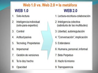 Web 1.0 se refiere a la World Wide Web anterior al impacto de la fiebre punto com en 2001, cuando las páginas web eran principalmente estáticas. Web 2.0, que comenzó a desarrollarse en 2003, se caracteriza por páginas web dinámicas y colaborativas donde los usuarios ayudan a crear y actualizar el contenido.