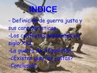 El documento resume las características de una guerra justa y analiza varios conflictos del siglo XXI como la guerra de Siria, las guerras de Libia, la Primavera Árabe, el conflicto de Gaza y la guerra de Afganistán, incluyendo sus comienzos, objetivos y desarrollos. Finalmente, cuestiona si existen guerras justas en la actualidad.