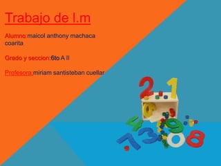 Este documento presenta una serie de ejercicios matemáticos de suma, resta, multiplicación, división, potencias y raíces cuadradas. Incluye operaciones como 346+435-(156+167)+6, 567+801-(500+259), 9x8:(3x2) y 48+3:9x4-144x2. El autor, Maicol Anthony Machaca de 6to A II, realiza los cálculos y anota las respuestas.