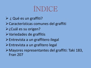 Este documento resume las características y orígenes de los graffitis. Explica que los graffitis surgieron en Nueva York a finales de los años 60 y describen diferentes estilos como tags, letras de pompa y throw ups. También incluye entrevistas a grafiteros que explican que pintan por expresión personal y para evitar ofender a otros.