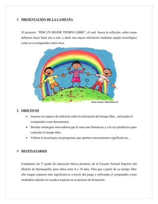 El documento presenta un proyecto para estudiantes de tercer grado sobre el uso del tiempo libre. El proyecto busca reflexionar sobre cómo usar mejor el tiempo libre utilizando la tecnología como herramienta, incluyendo programas educativos en la web. El proyecto incluye actividades como juegos educativos en línea y foros para opinar sobre el uso del tiempo libre.