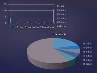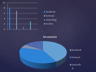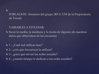 El documento resume los resultados de una encuesta realizada a 19 estudiantes sobre el uso de redes sociales. La encuesta incluyó preguntas sobre qué red social usan más, con qué frecuencia la usan, para qué sirven y cuánto tiempo pasan en ellas. Los resultados mostraron que Facebook es la red más utilizada, la usan diariamente y principalmente para comunicarse. El tiempo promedio dedicado es de 2 horas.