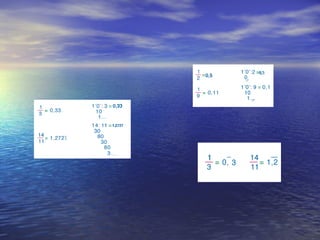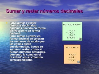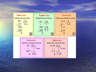 El documento describe diferentes métodos para realizar operaciones matemáticas con números decimales, incluyendo sumar, restar, multiplicar y dividir. Explica cómo alinear los números decimales para la suma y resta, cómo determinar el número de decimales en el resultado de la multiplicación, y cómo manejar los ceros y comas cuando el cociente es decimal en una división.