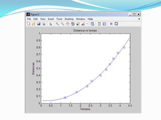 El documento describe un experimento para medir el desplazamiento de un carro al que se le amarró una masa y se dejó caer por gravedad a lo largo de una pista marcada. Se midió el tiempo que tardó el carro en recorrer distancias de 10 cm utilizando un cronómetro. Luego, los datos de tiempo y distancia se graficaron en MATLAB y se ajustó una curva polinómica de segundo grado para modelar el desplazamiento del carro en función del tiempo.