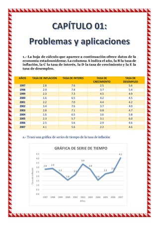 Este documento presenta datos económicos de Estados Unidos entre 1997 y 2007, incluyendo tasas de inflación, interés, crecimiento y desempleo. Se grafican las tasas de inflación para analizar sus tendencias a través de los años, observando que generalmente aumentó, especialmente en 2007. También se muestran diagramas de dispersión para analizar las relaciones entre inflación e interés, y crecimiento y desempleo, concluyendo que no están estrechamente relacionados.