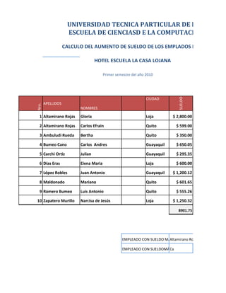 Este documento resume el cálculo del aumento salarial del 30% para los empleados de un hotel en Ecuador. Gloria Altamirano tuvo el sueldo más alto de $3,640, y Carlos Carchi el más bajo de $383.96, tras aplicar el aumento del 30% a los sueldos originales que variaban entre $350 y $2,800. El aumento total en la planilla de pago fue de $2,670.53, resultando en una nueva planilla de $11,572.28.