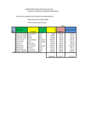 Este documento resume el cálculo del aumento salarial del 0.30% para los empleados del Hotel Escuela La Casa Lojana en el primer semestre de 2010. El empleado con el sueldo más alto era Zapatero Murillo con $2,800 y el más bajo era Altamirano Rojas con $295.35. Tras aplicar el aumento del 0.30%, el nuevo sueldo más alto fue de $3,640 para Zapatero Murillo y el más bajo de $383.96 para Altamirano Rojas.