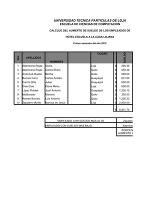Este documento resume el cálculo del aumento salarial del 30% para los empleados del Hotel Escuela a la Casa Lojana. Se lista el nombre, apellido, ciudad, sueldo original y nuevo sueldo de cada empleado. El empleado con el sueldo más alto es Zapatero Murillo con $3,640 y el más bajo es Altamirano Rojas con $383.96.
