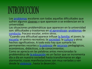 Este documento presenta un estudio sobre la deserción escolar entre jóvenes. Expone la justificación, objetivos e instrumentos de investigación como entrevistas. Analiza las causas comunes de deserción como falta de recursos económicos, problemas familiares y gusto por el trabajo. Muestra datos sobre tasas de deserción y recomienda informar a los jóvenes sobre oportunidades educativas para reducir este problema.