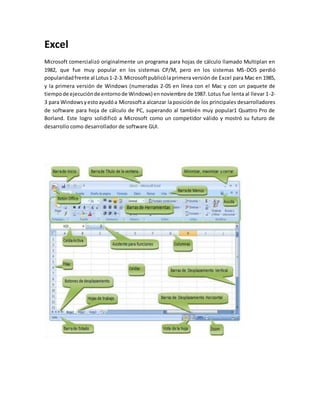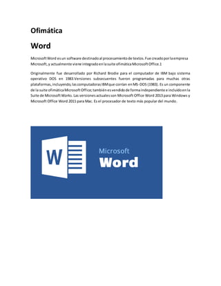 Microsoft Word es un software de procesamiento de textos creado por Microsoft. Originalmente desarrollado para IBM en 1983, ahora viene integrado en Microsoft Office. Es el procesador de texto más popular del mundo. Microsoft Excel es un programa de hojas de cálculo desarrollado originalmente en 1982 y ahora dominante en el mercado. Microsoft PowerPoint es un programa de presentaciones ampliamente usado en educación y negocios que permite crear presentaciones con texto e imágenes.