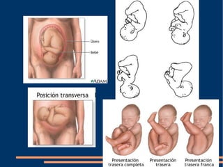 Este documento describe el proceso de trabajo de parto, incluyendo las diferentes etapas, presentaciones fetales, posiciones y maniobras utilizadas. Explica el proceso de dilatación cervical, las contracciones uterinas y los movimientos del feto durante el descenso y nacimiento. También cubre procedimientos como la episiotomía y la reparación posterior.