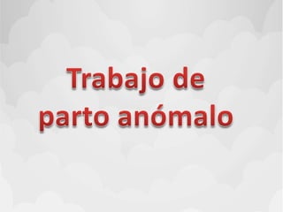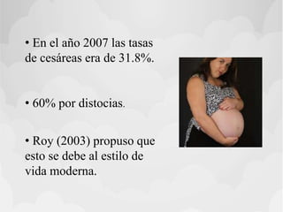 Este documento discute las causas de distocias o partos difíciles, que representan el 60% de las cesáreas. Puede deberse a anomalías de las fuerzas expulsivas, la presentación fetal, la pelvis materna u otros tejidos blandos. Factores como analgesia epidural, corioamnionitis, posición durante el parto y rotura prematura de membranas pueden causar disfunción uterina y retrasar el progreso del trabajo de parto. Una pelvis estrecha también aumenta el riesgo de distocia al limitar el esp