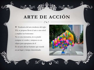 El documento describe el arte de acción y sus características, incluyendo el performance y el happening. También habla sobre la artista Atsuko Tanaka y su vestido eléctrico. Finalmente, explica el readymade de Marcel Duchamp y cómo influyó en el pop art y artistas como Andy Warhol.