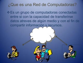 Una red de computadoras es un grupo de computadoras conectadas que pueden compartir información y recursos. Internet es una red global que conecta ordenadores para intercambiar datos, permitiendo buscar e intercambiar información y establecer comunicación con millones de personas. Para acceder a Internet se necesita una computadora, tarjeta de red, modem, proveedor de servicios de Internet y un navegador.