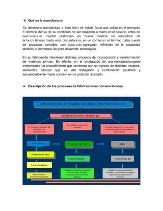 Este documento describe diferentes tipos de maquinaria utilizada en procesos de manufactura, incluyendo tornos, taladros, fresadoras y prensas. Define cada tipo de maquinaria y sus características principales. Describe tornos como CNC, paralelos, revólver y copiador, así como taladros eléctricos, percutores, de columna y radiales. También describe fresadoras horizontales, verticales, universales y de pórtico, así como prensas excéntricas e hidráulicas y cómo funcionan.
