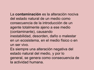 La contaminación es la alteración nociva del medio ambiente debido a la introducción de agentes contaminantes y causa daño a los ecosistemas y seres vivos. Existen diferentes tipos de contaminación como la atmosférica, hídrica, del suelo, radiactiva y más, que afectan distintos medios. Debemos esforzarnos por evitar que la contaminación se extienda y por devolver los medios a su estado natural.