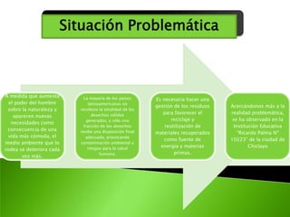 El documento presenta un programa de talleres llamado "ERRES" para promover la conservación ambiental en una escuela en Chiclayo, Perú. El programa busca diagnosticar los conocimientos previos de los estudiantes sobre reciclaje y aplicar talleres para enseñarles sobre las tres erres (reducir, reusar y reciclar) y fomentar hábitos ecológicos. Los resultados de encuestas antes y después del programa mostraron que los estudiantes mejoraron su comprensión de conceptos como contenedores de basura, reciclaje y reducción