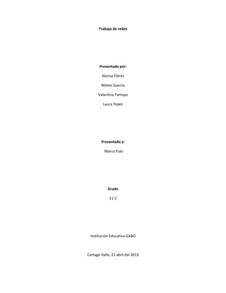 El documento presenta un informe técnico sobre la red de datos de una institución educativa que está experimentando problemas de conectividad. El informe incluye un inventario de los elementos de la red con su cantidad y una descripción de cada elemento, incluyendo su función, especificaciones técnicas y capa OSI a la que pertenece. Los elementos inventariados incluyen tomas de corriente, faceplates, jacks, canaletas, patch cords, cableado permanente, plugs, switch, router y rack.