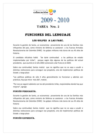 El documento habla sobre las políticas implementadas por el presidente Santos en Colombia. En particular, menciona que durante su mandato como ministro de Defensa, se infligieron los golpes militares más duros a las FARC en sus 45 años de historia. También señala que Santos quiere continuar con las políticas de estado implementadas por el expresidente Uribe, mejorándolas cuando sea necesario. Finalmente, indica que Santos cree que se necesitan políticas a largo plazo, no sólo de 4 años, para lograr resultados.