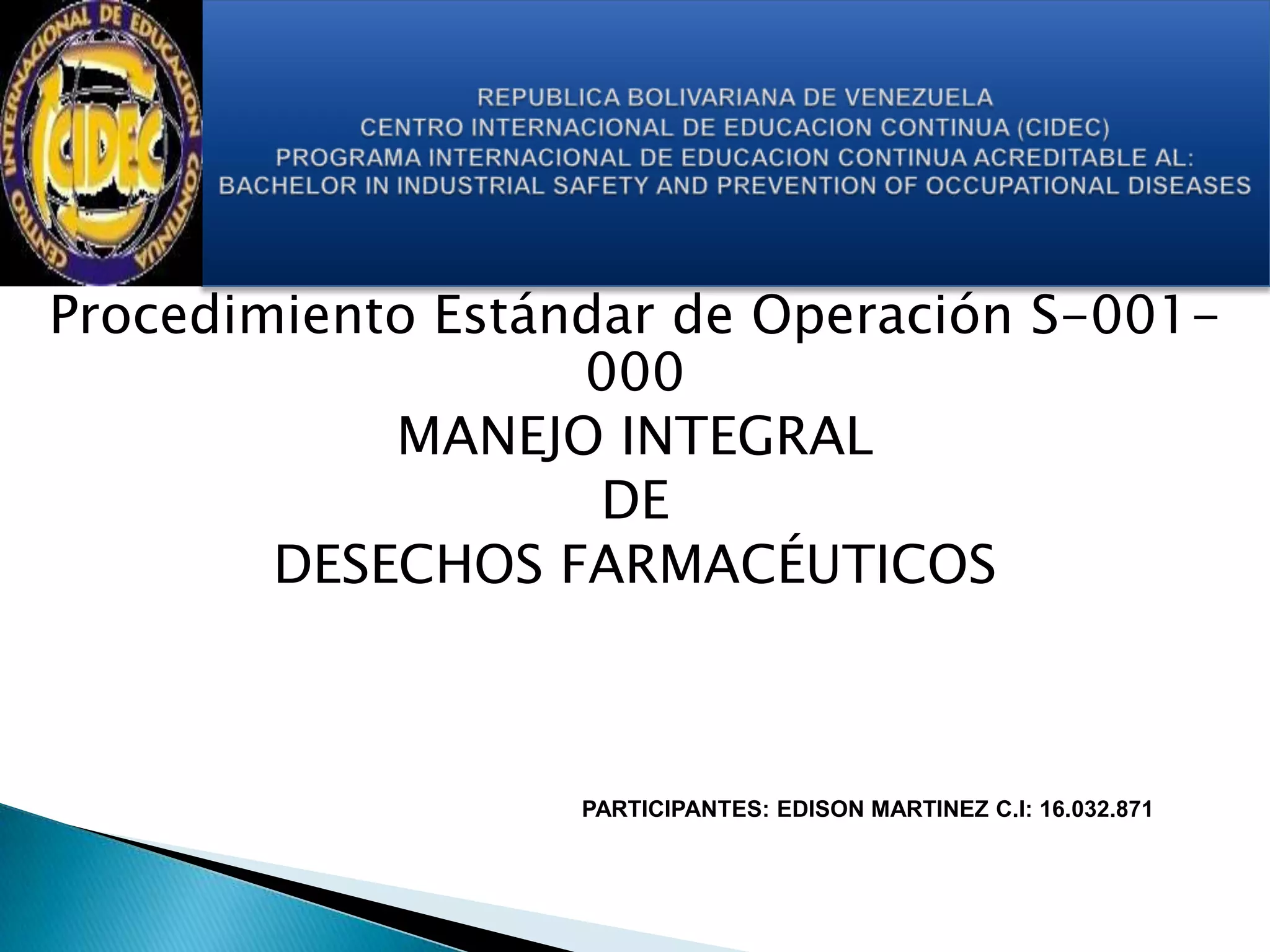 Este documento establece las normas y procedimientos para el manejo integral de desechos farmacéuticos generados en laboratorios. Todo el personal debe ser capacitado y los desechos deben ser clasificados, separados y almacenados temporalmente en el lugar donde se generan, utilizando recipientes adecuados según su naturaleza, antes de ser trasladados al almacén transitorio y posterior disposición final en rellenos sanitarios que cumplan con los requisitos ambientales.