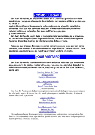 El documento proporciona información sobre San Juan del Puerto, incluyendo cómo llegar, lugares para visitar como el muelle y salinas del Tinto, una breve historia, detalles sobre el ayuntamiento y las principales fiestas como Carnaval, Semana Santa, El Rocío y las fiestas patronales de San Juan Bautista.