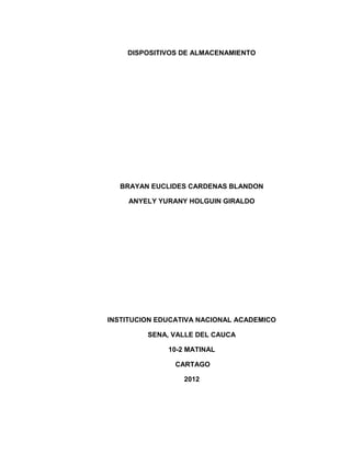 Este documento describe diferentes tipos de dispositivos de almacenamiento para computadoras, incluidos discos duros, unidades de estado sólido y unidades de disco. Explica la estructura y funcionamiento de los discos duros, así como estándares como IDE, SATA, UDMA y SCSI. El objetivo es proporcionar información sobre estos dispositivos de almacenamiento fundamentales y cómo han evolucionado para proporcionar mayor capacidad y velocidad.