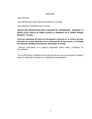 El documento resume la historia, evolución y proyección de los computadores. Describe cómo los computadores han evolucionado desde máquinas grandes en los años 40 hasta las computadoras personales de hoy. Anticipa que en el futuro los computadores se integrarán aún más en la vida diaria a través de lentes de contacto, pantallas en las paredes y dispositivos médicos avanzados. Además, los coches se conducirán automáticamente y los ordenadores serán más baratos que el papel.