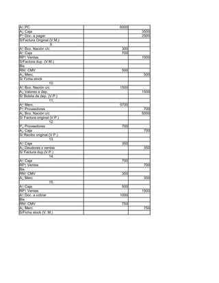 Este documento presenta las transacciones realizadas por una empresa durante un período. Se registran movimientos en las cuentas de caja, banco, mercaderías, valores de depósito, proveedores, capital, ventas, costo de ventas, alquileres pagados, documentos por pagar, documentos por cobrar, servicios, propiedad, planta y equipo y deudores por ventas. Finalmente, se presentan los mayores de cada cuenta con los saldos finales.