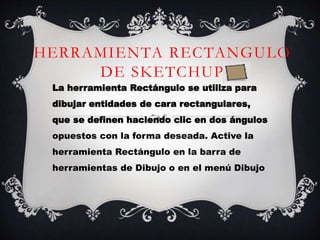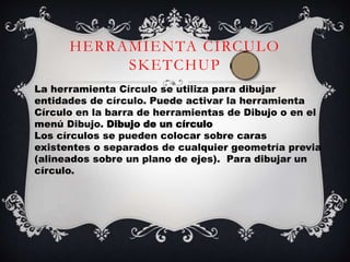 El documento describe 11 herramientas básicas de SketchUp: Rectángulo, Círculo, Arco, Pintar, Medir, Borrar, Empujar, Mover, Rotar, Orbitar y Zoom. Cada herramienta se utiliza para una tarea específica como dibujar formas, asignar materiales, medir, modificar geometría y controlar la vista.
