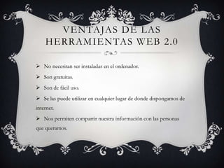 Las herramientas web 2.0 son aplicaciones en línea que permiten crear y compartir contenido como textos, presentaciones, fotos y videos sin necesidad de instalación. Ofrecen la ventaja de ser gratuitas, fáciles de usar y accesibles desde cualquier lugar con internet, aunque plantean riesgos como la privacidad de la información y posibles cambios en las condiciones del servicio.