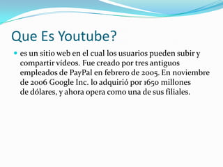 YouTube es un sitio web donde los usuarios pueden subir y compartir videos. Fue creado en 2005 por tres ex empleados de PayPal y fue adquirido por Google en 2006. Los usuarios usan un reproductor de Flash para ver videos de películas, programas de TV, música y videos amateur. Aunque YouTube prohíbe videos con derechos de autor, estos videos son abundantes en la plataforma.