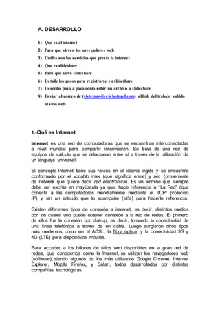 Este documento describe los pasos para registrarse en SlideShare y subir un archivo. Primero, se debe seleccionar la opción "Iniciar sesión" en SlideShare.net e introducir los datos personales. Luego, para subir un archivo se selecciona la opción "Subir" y se elige el archivo a subir, indicando si será público o privado. Una vez subido, el archivo estará disponible para que otros usuarios lo vean.