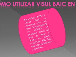 Visual Basic es un lenguaje de programación general con potencia para estructuras. SQL se usa para consultas y cálculos en tablas de datos. Los operadores incluyen aritméticos, relacionales y lógicos para asignaciones y comparaciones. Las palabras clave como SELECT, UPDATE, DELETE e INSERT permiten manipular datos en tablas de una base de datos.