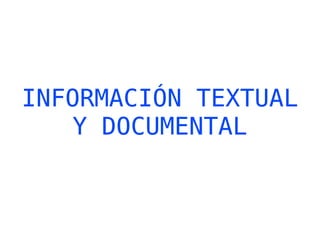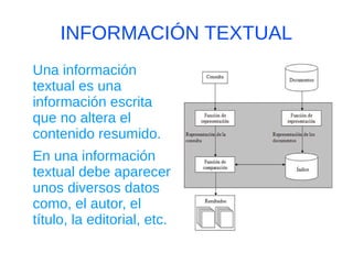 Este documento describe los diferentes tipos de información textual y documental. Explica que la información textual incluye datos como el autor y título sin alterar el contenido. Además, detalla que una ficha de información textual mide 14 x 21,5 cm y que las citas textuales deben ir entrecomilladas y pueden ir acompañadas de comentarios interpretativos. Finalmente, proporciona la página web utilizada para realizar el trabajo.