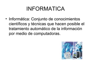 Este documento define varios términos relacionados con la tecnología de la información. Define informática como el tratamiento automático de la información por medio de computadoras. Explica que Internet es una red mundial de ordenadores que comparten un protocolo de comunicación. Describe una red como un conjunto de computadoras conectadas que comparten recursos e información. Además, define términos como programador, usuario, World Wide Web, blog, wiki, YouTube, wireless y K-rss.