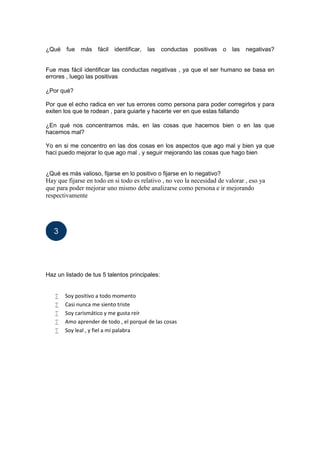 El documento describe las actividades que Kevin debe realizar como parte de su plan de vida universitaria, incluyendo debatir con compañeros sobre un video y completar actividades evaluadas por tutores. Kevin expresa que su sueño es ser mecánico de aviones y obtener una ingeniería para continuar capacitándose y alcanzar sus metas de comprar un vehículo y casa. Planea cumplir sus objetivos paso a paso, estudiando, trabajando en lo que ama y obteniendo dinero para sentirse satisfecho.