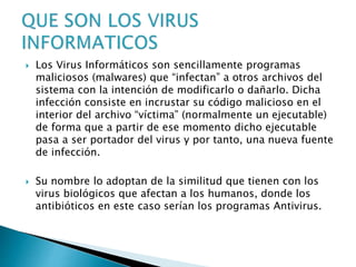 Este documento describe los diferentes tipos de virus informáticos, incluyendo que pueden infectar múltiples archivos, ser polimórficos, residentes en memoria o no, furtivos, traer otros virus, ocultar infecciones, y permanecer en la computadora aún después de formatear el disco duro. También define troyanos, gusanos, bombas lógicas o de tiempo, hoaxes y jokes.