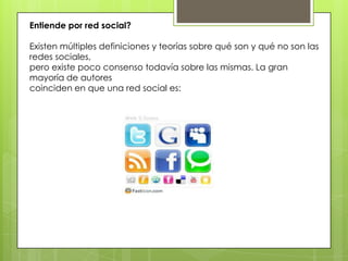 El documento define las redes sociales como sitios web que permiten a los usuarios relacionarse, comunicarse y compartir contenido. Específicamente, las redes sociales permiten a los usuarios 1) crear un perfil público, 2) conectarse con otros usuarios, y 3) ver las conexiones de contactos. Las redes sociales directas son aquellas en las que los usuarios comparten intereses comunes e interactúan entre sí en igualdad de condiciones controlando la información compartida. Algunos ejemplos de redes sociales directas mencionados son Facebook,