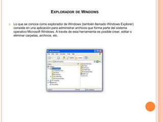 El 'Explorador de Windows' es una herramienta de administración de archivos del sistema operativo Microsoft Windows, permitiendo crear, editar y eliminar archivos y carpetas. Se basa en tres pilares fundamentales: unidades de almacenamiento, funcionamiento que ha evolucionado desde su aparición en Windows 95, y diversas funciones como la previsualización de imágenes y gestión de archivos. A lo largo del tiempo, ha incorporado características como barras de tareas y la integración con Internet Explorer, aunque también ha presentado vulnerabilidades.