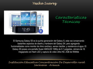 El Samsung Galaxy S5 es la quinta generación del Galaxy S, que conserva el diseño del S4 pero agrega funcionalidades como monitor de ritmo cardíaco, sensor dactilar y resistencia al agua y polvo. Posee una pantalla Super AMOLED de 5.1 pulgadas, cámara de 16 megapíxeles y 2GB de RAM.