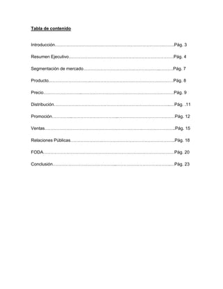 El documento presenta un plan de mercadeo para el teléfono Sony Xperia Go. El plan incluye un análisis de segmentación del mercado, las características y beneficios del producto, estrategias de precios, distribución, promoción, ventas y relaciones públicas. También incluye un análisis FODA y proyecciones para el futuro como expandirse a nuevos mercados y desarrollar nuevas tecnologías como 4K. El objetivo es satisfacer las necesidades de comunicación de clientes jóvenes y adultos que se exp