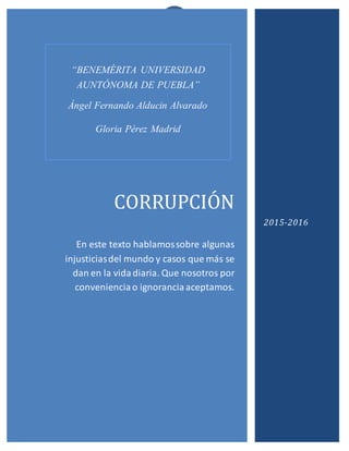 La corrupción se refiere al mal uso del poder para obtener una ventaja ilegal o beneficio personal. El documento analiza ejemplos de corrupción como realizar obras públicas sin licitación para beneficiar a empresas, eludir impuestos, robar recursos públicos, y recibir sobornos. También discute las consecuencias negativas de la corrupción como reducir los ingresos fiscales, retrasar el desarrollo, y erosionar la legitimidad del gobierno. Finalmente, la ONU señala que la corrupción cuesta al mundo $