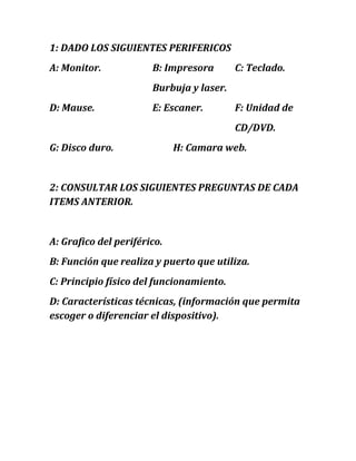 El documento proporciona información sobre diferentes periféricos de una computadora como monitor, impresora, teclado, mouse, escáner, unidad de CD/DVD, disco duro y cámara web. Explica el funcionamiento de un monitor, clasificando los diferentes tipos de monitores según estándares como MDA, CGA, EGA, VGA y SVGA. También clasifica los monitores según su tecnología, describiendo monitores CRT y LCD.