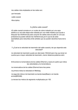Este documento describe los diferentes tipos de cables y medios físicos utilizados en las redes de computadoras, incluyendo cables estructurados, cable coaxial, par trenzado y fibra óptica. Explica sus características, velocidades de transmisión, normas de codificación de colores y ventajas/desventajas. También enumera los factores que afectan el rendimiento de la red y las categorías de cables de par trenzado.