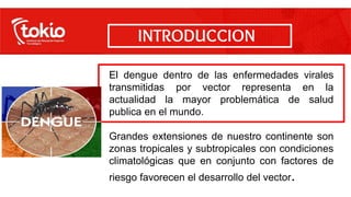 El dengue es causado por un virus transmitido por mosquitos del género Aedes y representa un gran problema de salud pública. Los síntomas incluyen fiebre alta, dolores musculares y posible sangrado. No existe un tratamiento específico, solo se controlan los síntomas. La prevención requiere eliminar los criaderos de mosquitos y usar repelentes.