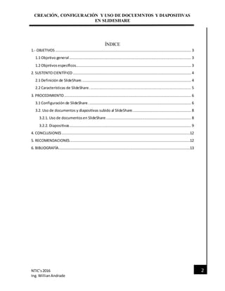 Este documento describe los pasos para crear una cuenta, configurar y usar documentos y diapositivas en la plataforma SlideShare. Explica las características y utilidad de SlideShare, el procedimiento para subir archivos y cómo acceder y descargar los materiales compartidos.
